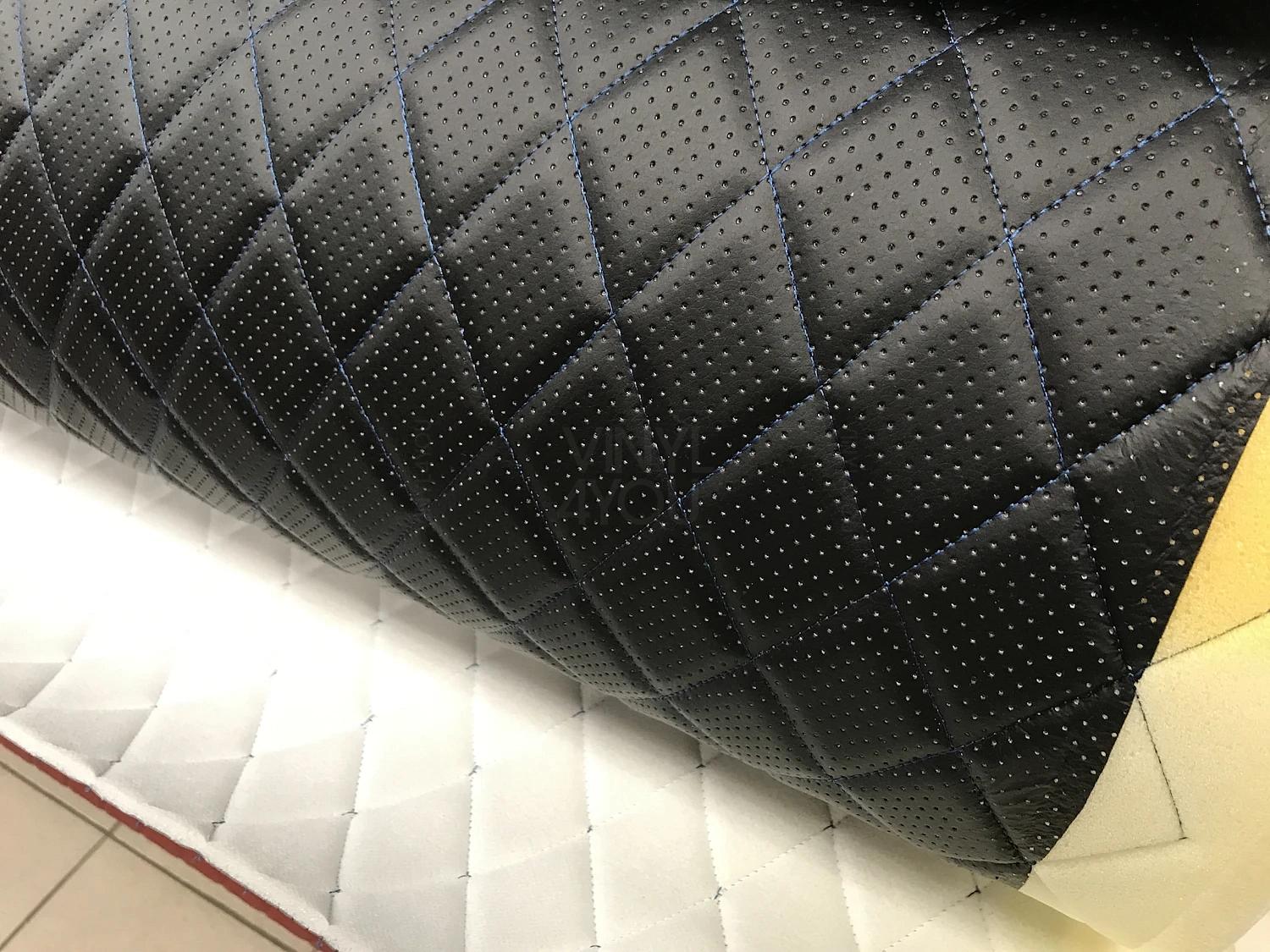 Экокожа стеганая перфорированная Ромб Черная с Синей строчкой